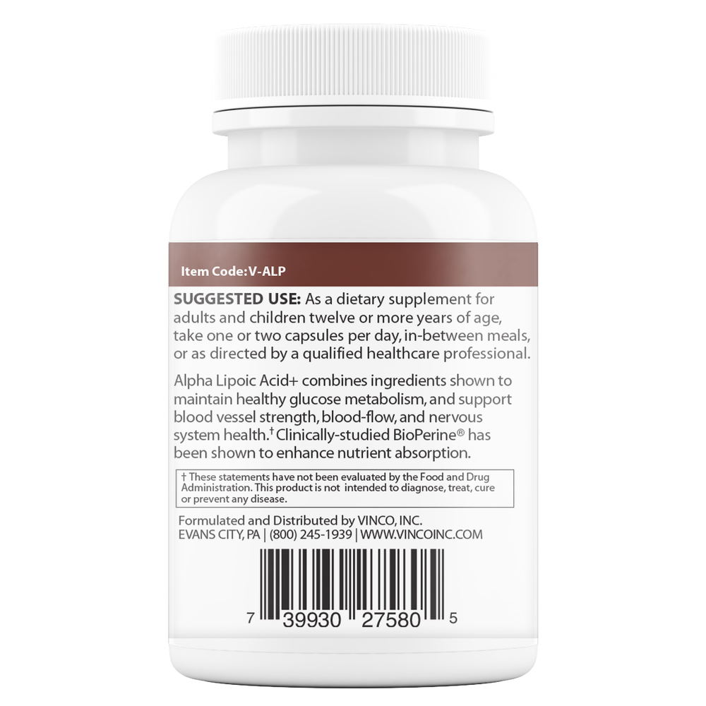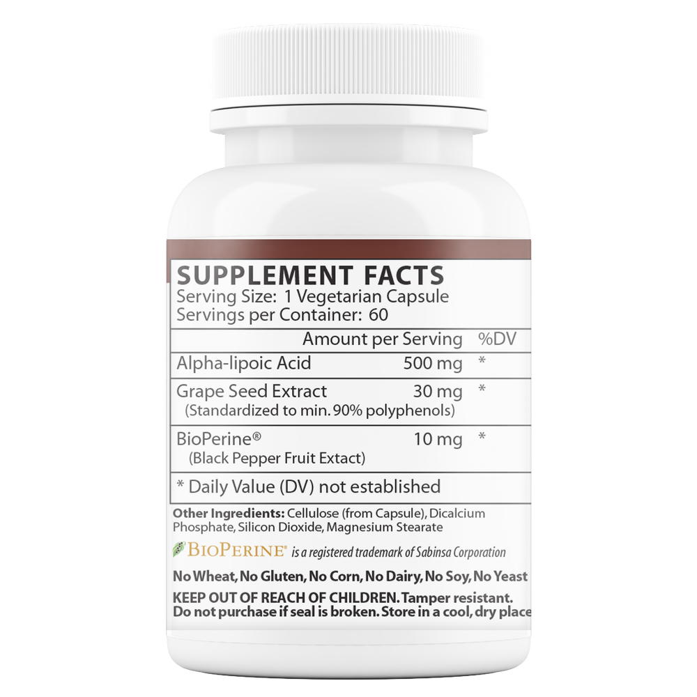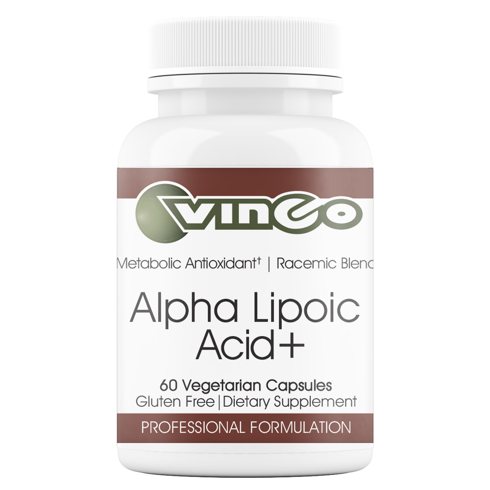Vinco’s Alpha-Lipoic Acid+ is in the Racemic Form (R and S Isomers), known to be the most stable and absorbed form for oral use. It has been suggested that the presence of S-lipoic acid in the racemic mixture may limit the polymerization (process in which a small molecule becomes larger) of R-lipoic acid and enhance its bioavailability.† We have also added Grape Seed Extract and clinically-studied BioPerine® to enhance the antioxidant benefits and absorption.